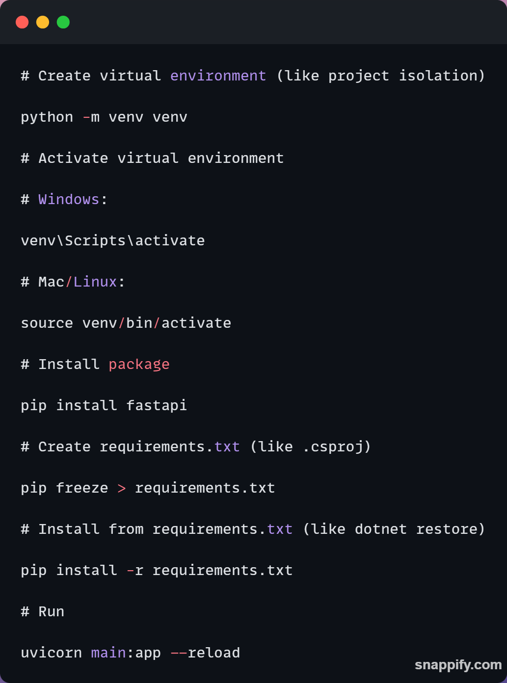 A quick reference guide for C# developers learning Python, focusing on common patterns and key differences.